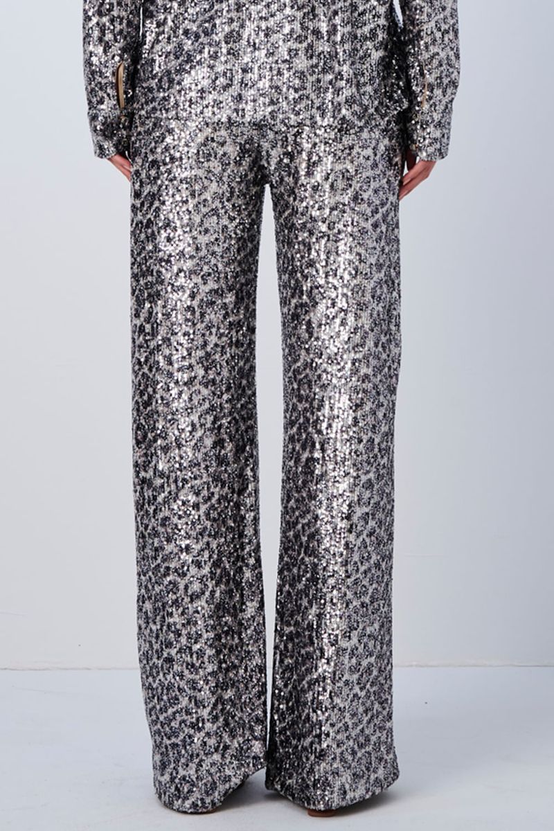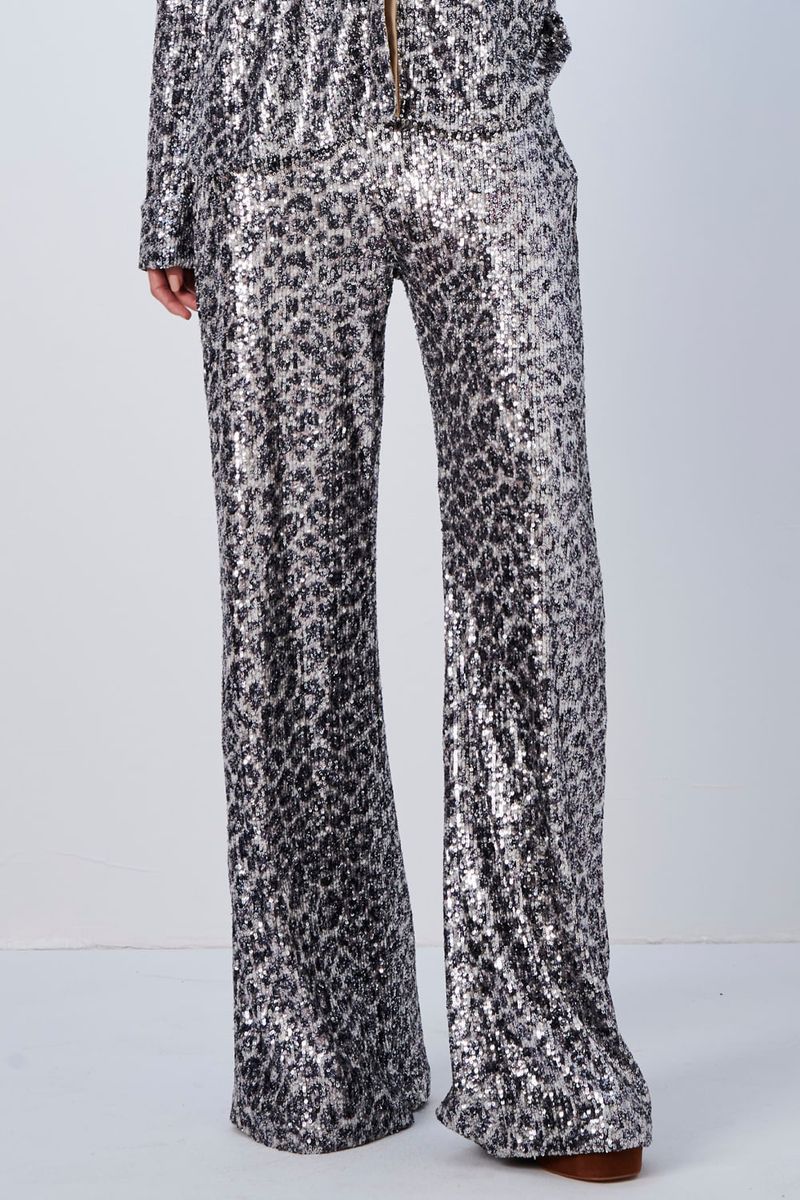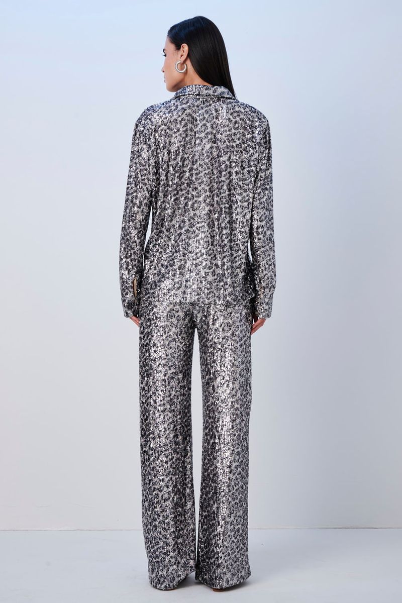 A Calça Pantalona com Paetê Platinada é a escolha ideal para quem busca glamour e sofisticação em ocasiões especiais.