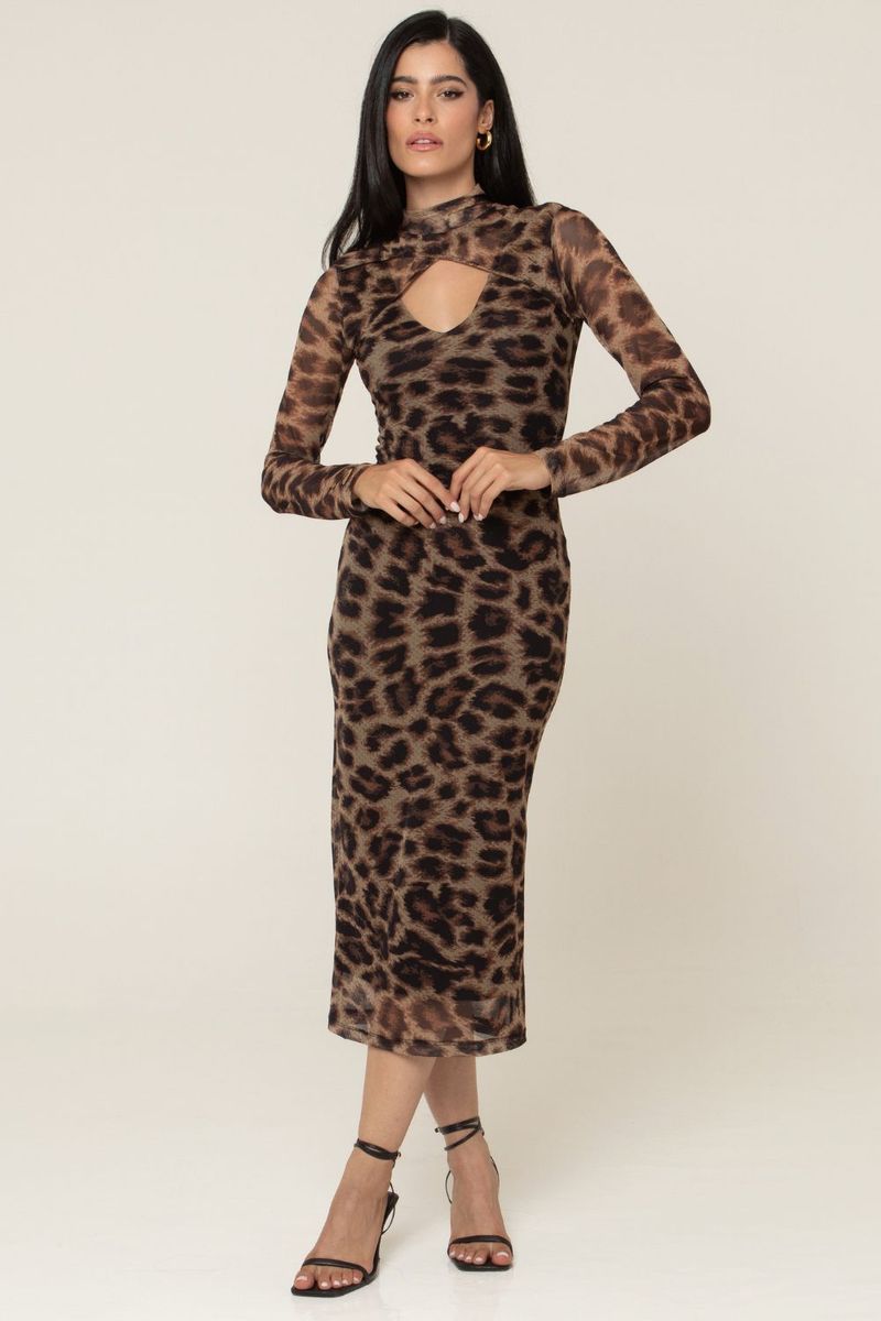 Este vestido midi apresenta uma estampa de onça que adiciona uma dose de ousadia ao visual O recorte com abertura no busto proporciona um toque sedutor e diferenciado um ajuste seguro.